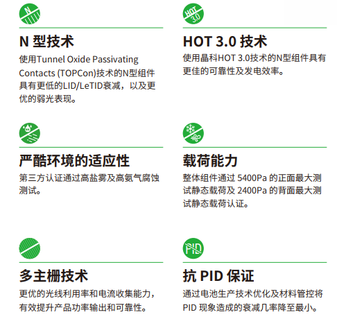 HOT 3.0 技术:晶科自主研发的 HOT 3.0 技术进一步强化组件可靠性,同时提升发电效率,尤其在高温环境下仍能保持稳定性能。