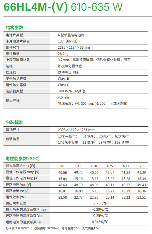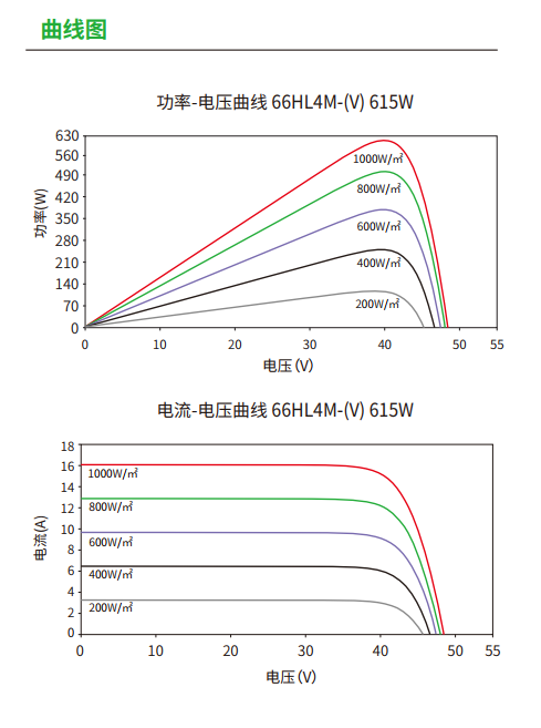 三、关键参数1. 电性能参数(STC)标准测试条件(STC)为:光照强度 1000W/m²、电池温度 25°C、大气质量 1.5,以 66HL4M-(V) 615W 型号为例,其功率 - 电压、电流 - 电压曲线显示,随光照强度降低(从 1000W/㎡降至 200W/㎡),功率与电流呈线性下降,符合高效组件的弱光响应特性(具体数值可参考文档附图)。